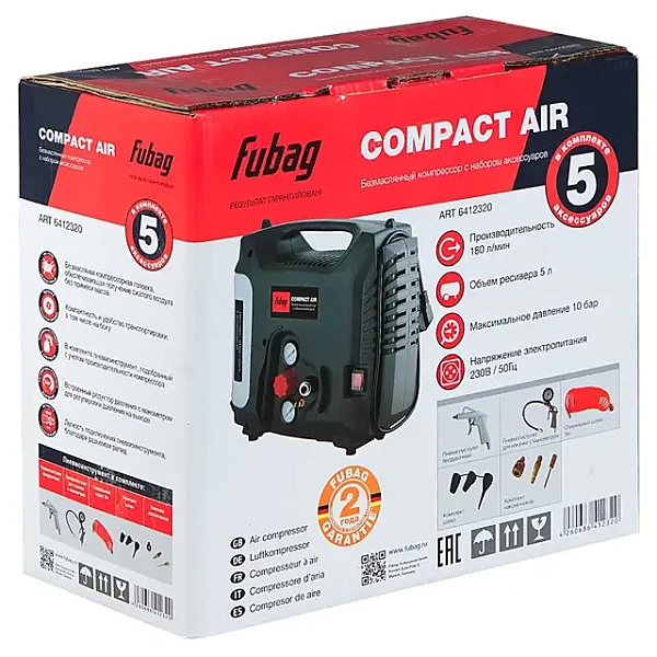 Купить Безмасляный компрессор FUBAG Compact Air + набор из 5 предметов в Екатеринбурге легко — просто позвоните по телефону: 8-800-551-11-01