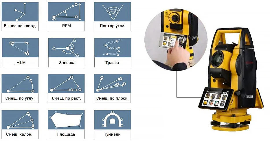 Управление тахеометром A1 осуществляется при помощи интуитивно понятного, но в то же время мощного и многофункционального встроенного ПО.