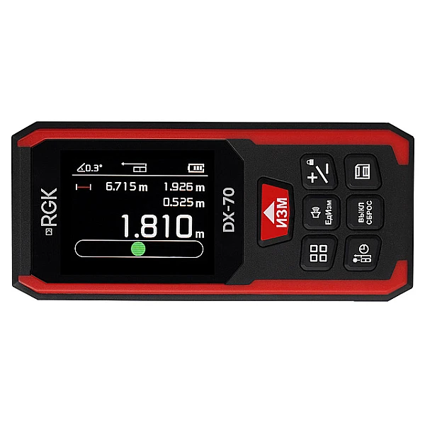 Лазерный дальномер RGK DX70 представляет собой высокопроизводительный прибор строительного назначения в прочном двухслойном корпусе, предназначенный для определения размеров и дистанций до целевых объектов на расстоянии до 70 м, а также способный выполнять измерения уклонов благодаря встроенному инклинометру. От лазерных рулеток других, более дешевый серий данного бренда, с таким же измерительным диапазоном, прибор отличается улучшенной точностью, обеспечивая погрешность линейных измерений не более ±1,5 мм, поддержкой расширенного перечня режимов и высокой наглядностью, что обеспечивает цветной графический дисплей.