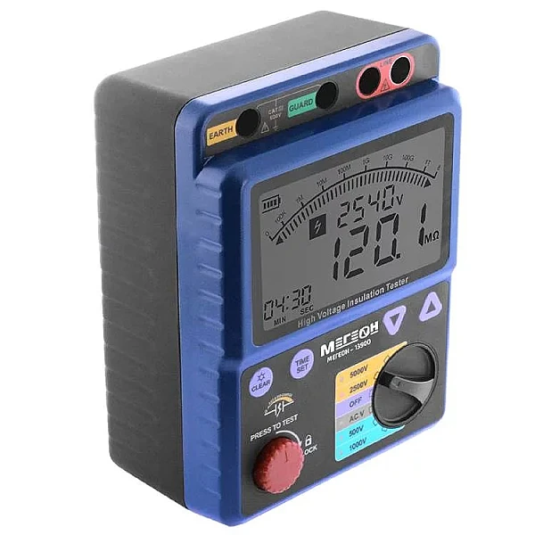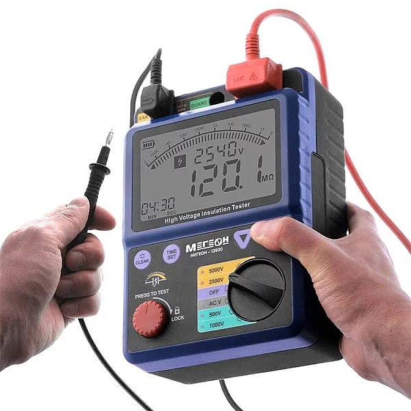 Портативный цифровой измеритель МЕГЕОН 13900 используется для определения сопротивления изоляции, а также для измерения постоянного/переменного напряжения и индекса поляризации (PI). Применяется профессиональными работниками для диагностики, техобслуживания и ремонта разных электрических двигателей, электроустановок, оборудования и выключателей. Устройство снабжено функцией автоматического переключения измерительных диапазонов (от 2 до 5). Присутствует звуковая и визуальная сигнализации подачи испытательного напряжения и авторазряда цепи после замера. Прибор имеет возможность автосохранения измеренных результатов на внутреннюю память.