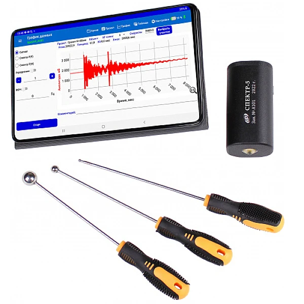 • Интегрированное решение, включающее мобильный беспроводной блок (датчик), приложение на планшетном компьютере и набор ударных элементов для тестирования объектов методом ударного эха.